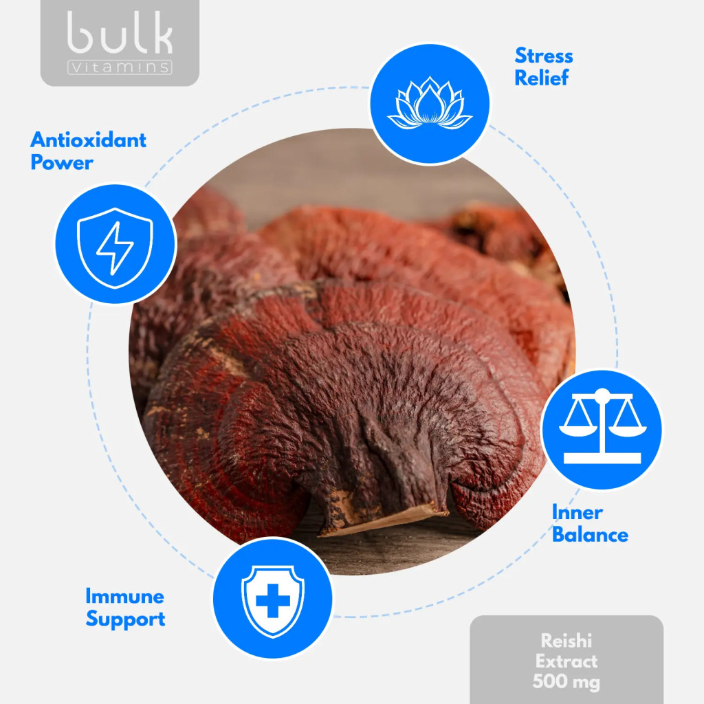 - Reishi Extract (500mg daily, 10:1, 30% polysaccharides) — supports immune health, vitality, and balance.