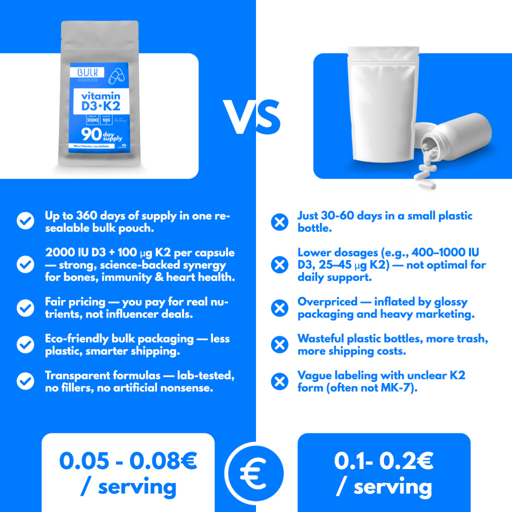 - 2000 IU Vitamin D3 + 100 µg Vitamin K2 per capsule